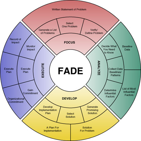 This is the model in graphic form, including a little more detail of what can be included in each step. As you can see there are many parts within each of the basic four steps. Start in the middle of the circle and move out in each phase to see the sequential flow of the FADE process.